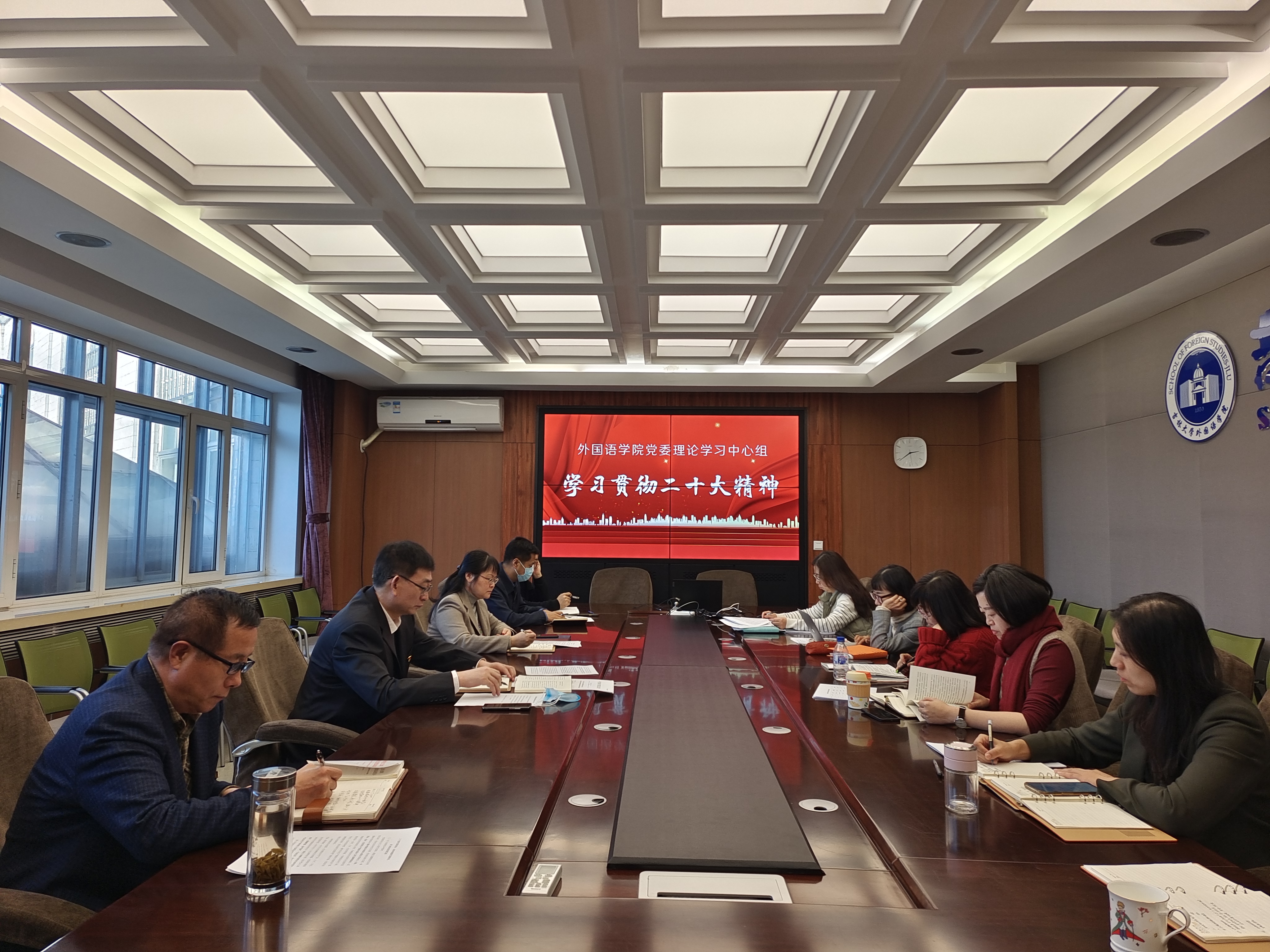 在外语楼318会议室召开党的二十大精神专题学习研讨会。学院领导班子成员、党委委员等学院党委理论学习中心组成员参加会议,会议由党委书记刘昌松主持。