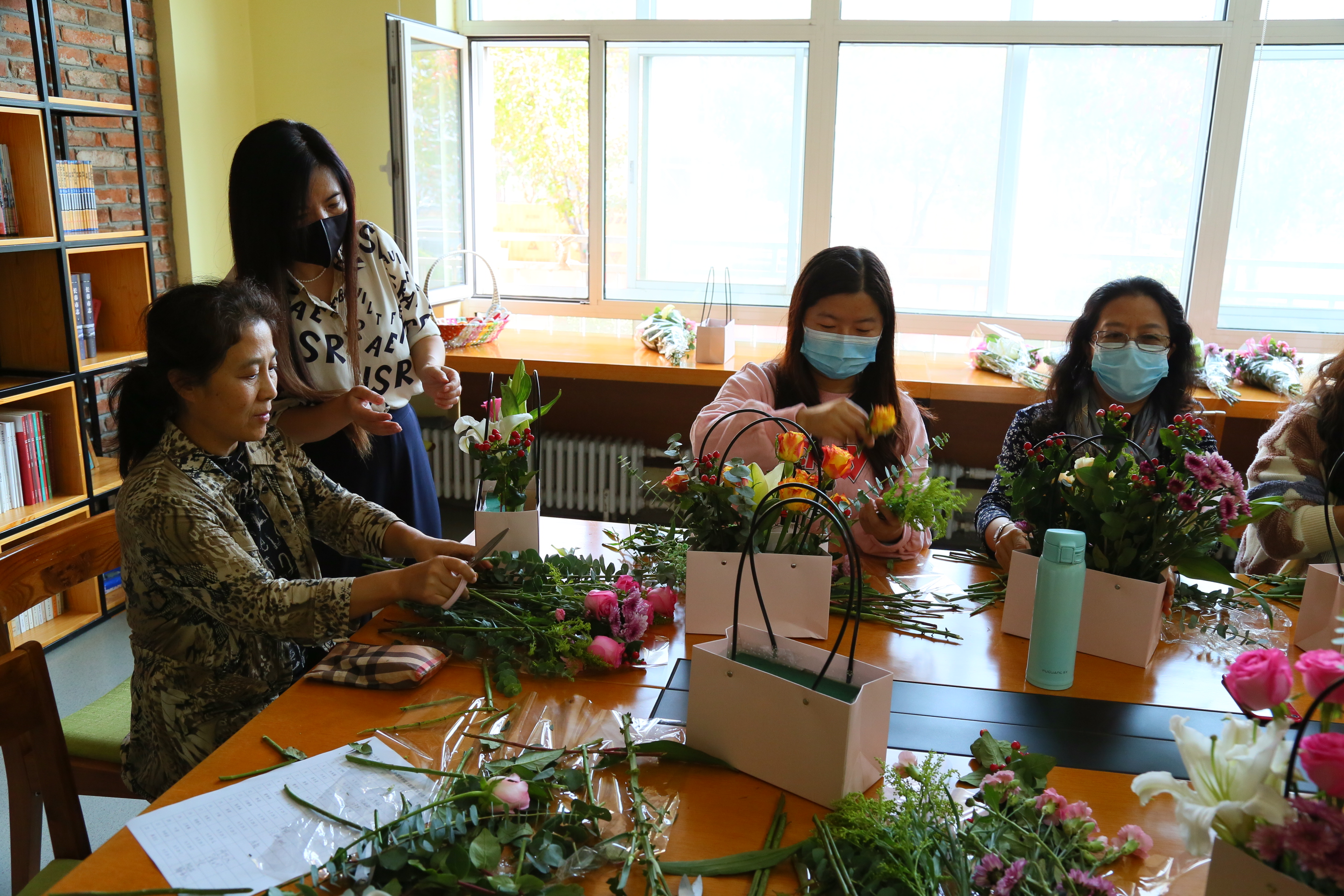 活动邀请了专业花艺师进行现场授课,通过向大家介绍花材、容器、色彩搭配、日常养护、花枝长短修剪、插花造型等基本技巧及注意事项,进行了现场插花教学。活动中,女教职工在花艺师的指导下进行插花,有插花基础的女教职工尝试了与众不同的插花艺术,同样美丽别致。大家在限定时间内采用自带的材料,完成插花作品,作品色彩讲究、花型错乱有致。参与人员通过投票,评选出了本次活动的最佳创意作品和最佳艺术作品。