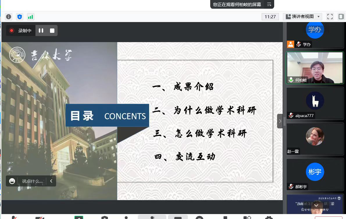 本次分享会分为成果介绍、做学术科研的意义、做学术科研的方法和交流互动四个部分。首先,何柏岐介绍了自己的学术科研成果和各级期刊与项目运行。随后,何柏岐从同学们关心的科研成果问题入手,阐释了做学术科研的意义价值,着重强调了学术科研有形的收获的价值和学术科研本身对同学们能力上的帮助。接着,何柏岐就论文和大创两种学术科研形式向同学们介绍了学术科研的方法,并分享个人经验和体会。最后,何柏岐与同学们交流互动,现场气氛热烈。本次活动圆满结束。