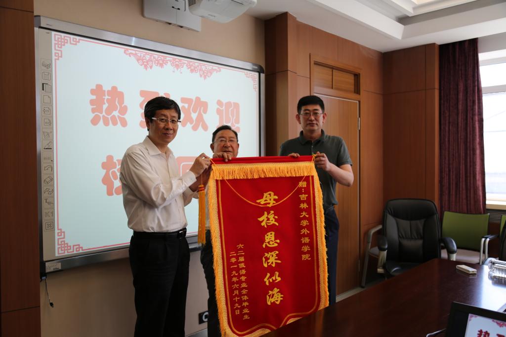 6月21日下午学院举办了校友座谈会,学院院长周异夫、学院党委书记刘昌松、俄文系教授苗幽燕及党办主任刘多义等同志参加了此次座谈。座谈会上,周异夫院长和刘昌松书记代表学院对校友的到来表示了热烈的欢迎,并对校友多年以来对学院的发展所给予的关心和支持表示衷心的感谢。随后,周异夫院长为各位校友详细介绍了学院的发展现状,校友们都对学院的发展深感自豪。校友们也分享了毕业之后各自的奋斗历程。最后,校友郭文魁代表同届校友给学院送上了锦旗并赠送个人藏书,表达对学院的感激之情。座谈会结束之后,周异夫院长带领校友参观了学院的报告厅、语音室、同传室、录播教室及教研室等。参观完毕,大家在外语楼门前合影留念。