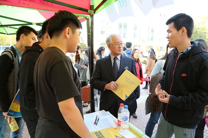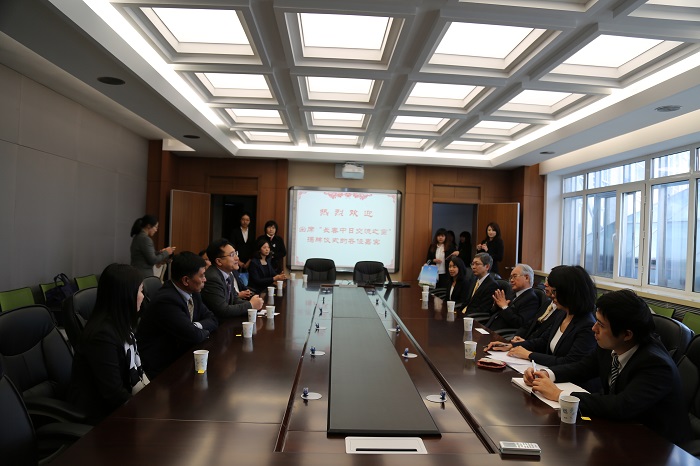 举办更高水平日语活动的契机;王宇介绍了长春市的对日交流现状,希望我校能够充分利用“中日交流之窗”这一平台,在日语人才培养方面取得更好的成绩。刘德斌校长助理、阿南惟茂所长和王宇主任共同为“长春中日交流之窗”揭牌。