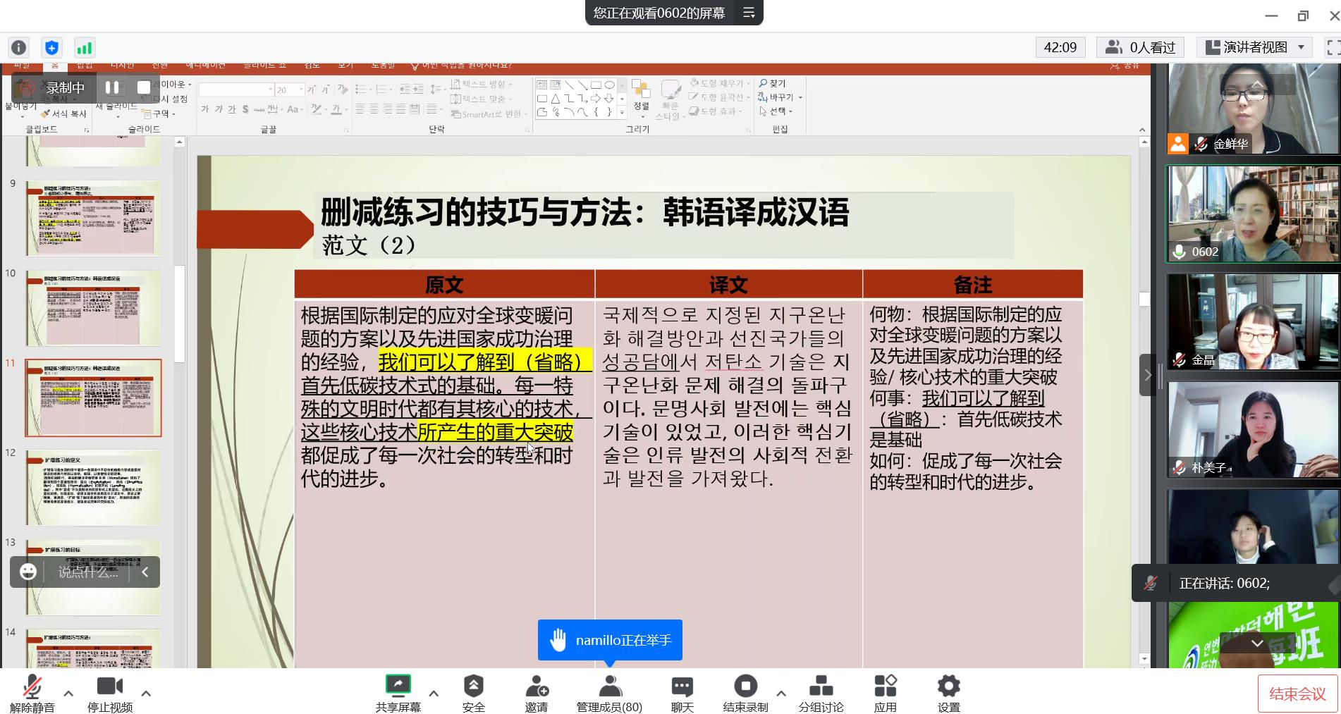 讲座中金珍我老师主要讲授了中韩韩中口笔译翻译技巧中的“删减”“扩增”和“连贯练习”等内容。“删减”中可以使用何人、何时、何地、何事、何物、如何的六何原则来省略译文中冗余信息。通过“扩增”来达到译文的显化、简化、规范化、整齐化译文。金珍我老师讲述的翻译技巧提高了翻译的效率及准确性。