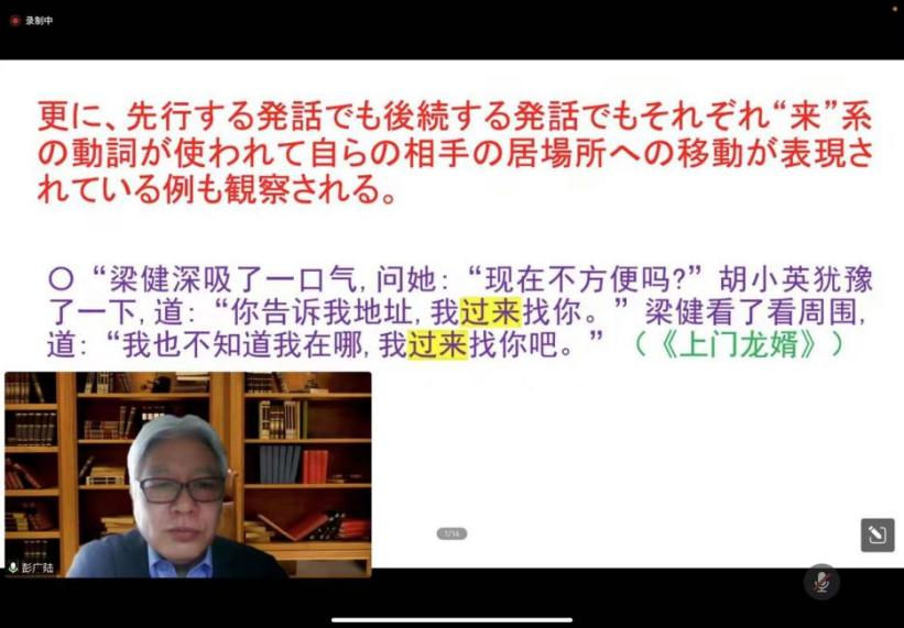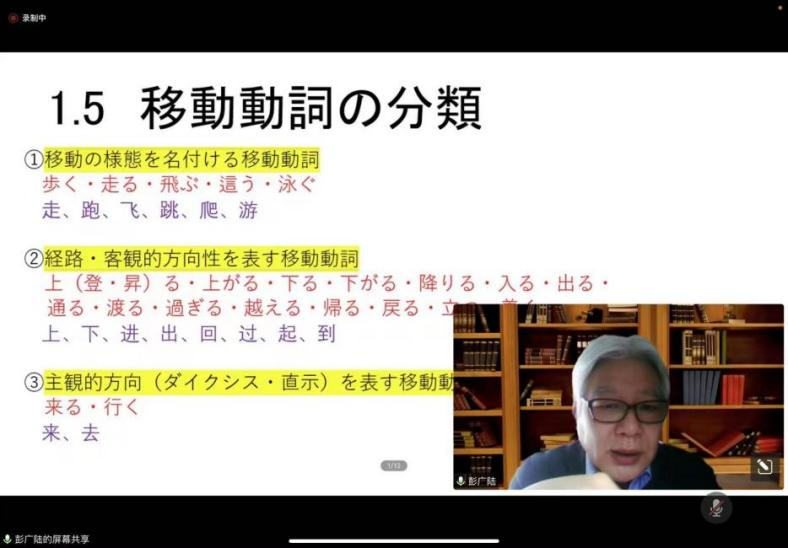 等全国各大高校的师生二百余人参与。彭广陆教授将自己宝贵的学术经验和学术成果分享给在座的每一位师生,是一场精彩纷呈、给人以启迪的学术讲座。彭广陆教授讲座中的细微之处都体现出作为日语语言学专家谦虚谨慎、积极探索、勇于创新的宝贵品质和治学精神。借此线上相聚的机会,参加讲座的师生们对视点问题、汉日位移表达的对比问题以及汉日对比的研究方法等都有了深入的了解,开拓了学术视野,加强了学术交流。