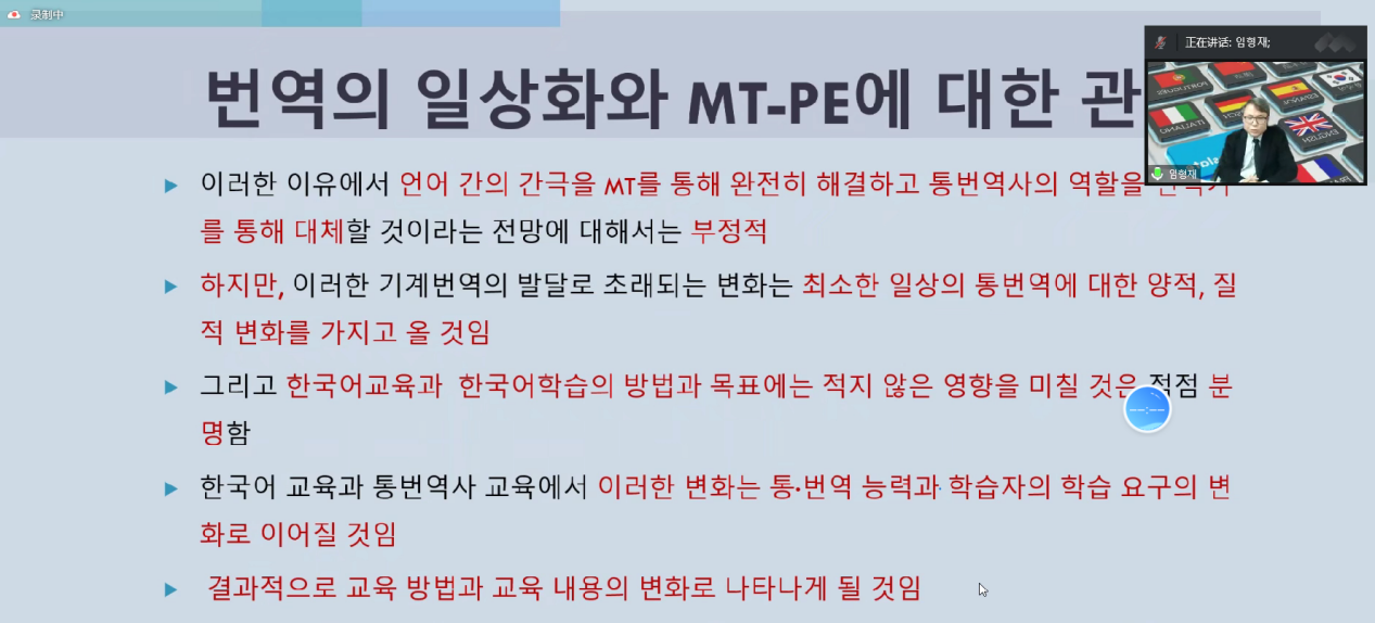 首先,林亨栽教授向我们阐述了翻译的时代价值。之后林教授向我们传达了信息在不同时期的特点,新时代的信息流已经较以往发生了很大的变化。随后,林亨栽教授立足于新的发展阶段,指出信息共享使我们当前翻译事业发生了很大变化,机器翻译+译后翻译服务已经成为一种备受瞩目的翻译模式,这种新变化对韩国语教育和学习也是一种新的挑战。林亨栽教授通过图表和举例的方式让我们对信息流的变化有了清晰的认识,在场师生受益匪浅。