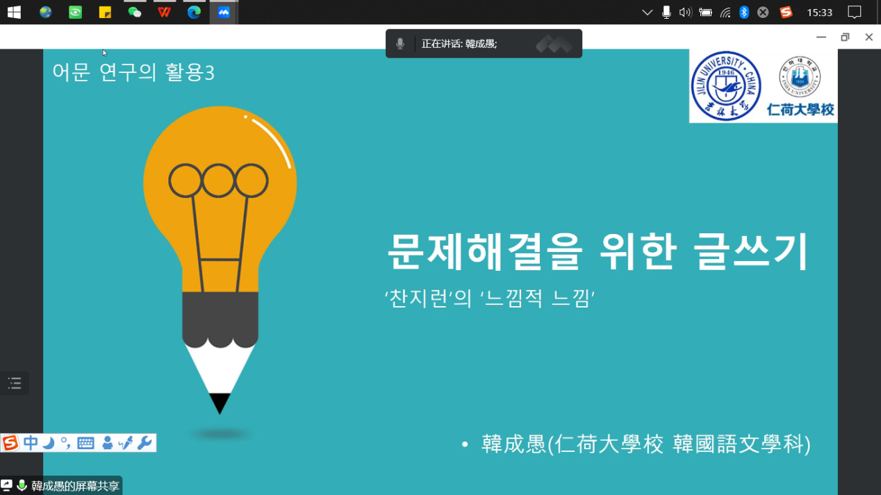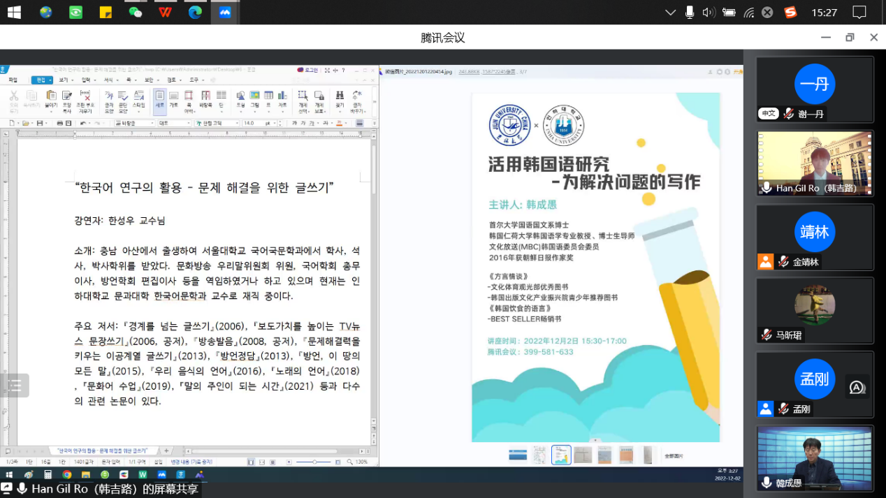 邀请,2022年12月2日15时30分,首尔大学国语国文系博士、韩国仁荷大学韩国语学专业教授、博士生导师、文化放送(MBC)韩国语委员会委员、2016年朝鲜日报作家奖获得者韩成愚老师在云端通过腾讯会议平台做了一场主题为“活用韩国语研究——为解决问题的写作”的学术讲座,讲座由朝文系外教韩吉路老师主持,参加讲座的人员有acg漫画