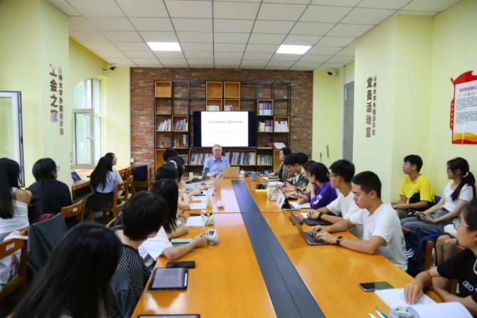 副院长张蕊副教授主持。马尔滕·范·德尔登教授在课程中介绍了墨西哥国宝级作家卡洛斯·富恩特斯的生平及其文学成就,并通过对四篇短文的细致分析,带领同学们认识了作家的写作手法和文学批评观点,使他们更深入地了解了作家,拓宽了阅读视角。